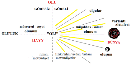 Soyut olunum ve Oluluk, sadece (olusal/ontolojik bakımdan) gayri nesnel (batıni) yönde, evrensel müşterekliği sağladığından, ruhanî bağlamda kullanacağımız tasvir ve tanımlamalar Şekil 1’in sol (göresiz) yarısına aittir. Diğer tarafta, oluşum (zahirî) somut olunumdur, yani şekle bürünerek varlanıştır. Nesnelliğiyle boyutlar içeren dünyevî, yani fizikî, zihnî ve vicdanî bağlamlara sahip mevcudiyetler Şekil 1’in sağ (göreli) yarısında konumlanmışlardır.[5]