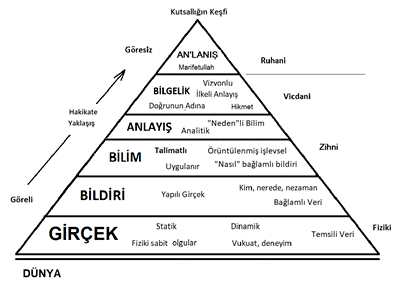 En derin bilgi, Hû’nun edindireceği Kendilik bilgisidir. Bu bilgiye vardıracak zirve bilgelik göresizdir. Bu zirve sayesinde ancak en üst “anlanış” hali olasıdır. Bu derinliğe erişimin, göreli öğreni aşamalarından terfi ederek, nihayetinde münezzeh İlahî Rıza ile gerçekleşeceği unutulmamalıdır. Kutsal keşif yolunda bilgilenme aşamalarından bekleyeceğimiz katkılar, İlahî Aidiyet deneyiminin başarıyla sonuçlanmasına yönelik olmalıdır. Şekil 6’da gördüğümüz her basamaktan beklenen katkı, üreteceği bilginin derinliği ile direkt bağlantıdadır. Söz konusu aşamalar tabandan yukarı doğru şunlardır: